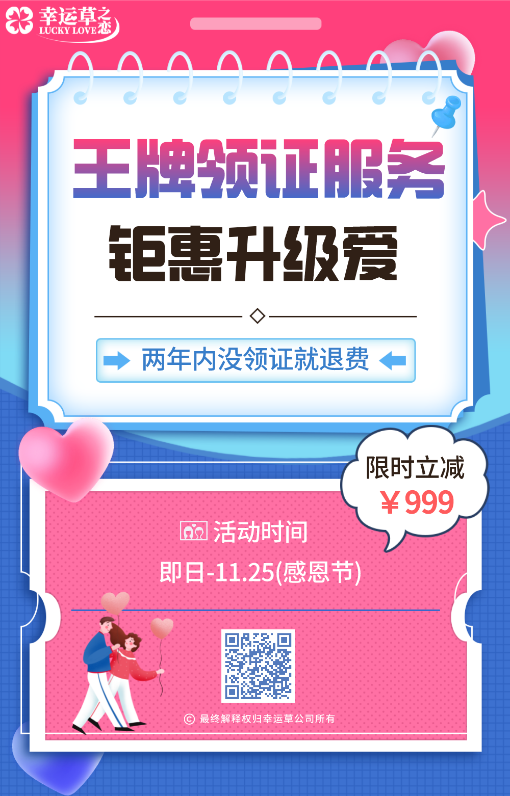 更新了一条心情: ψ(*`ー´)ψ 领证福利到!领什么证?——当然是结婚证呀!幸运草之恋包领结婚证服务,两年没领证就退费,在感恩节(11月25日)还有立减优惠,不要错过咯! 全文