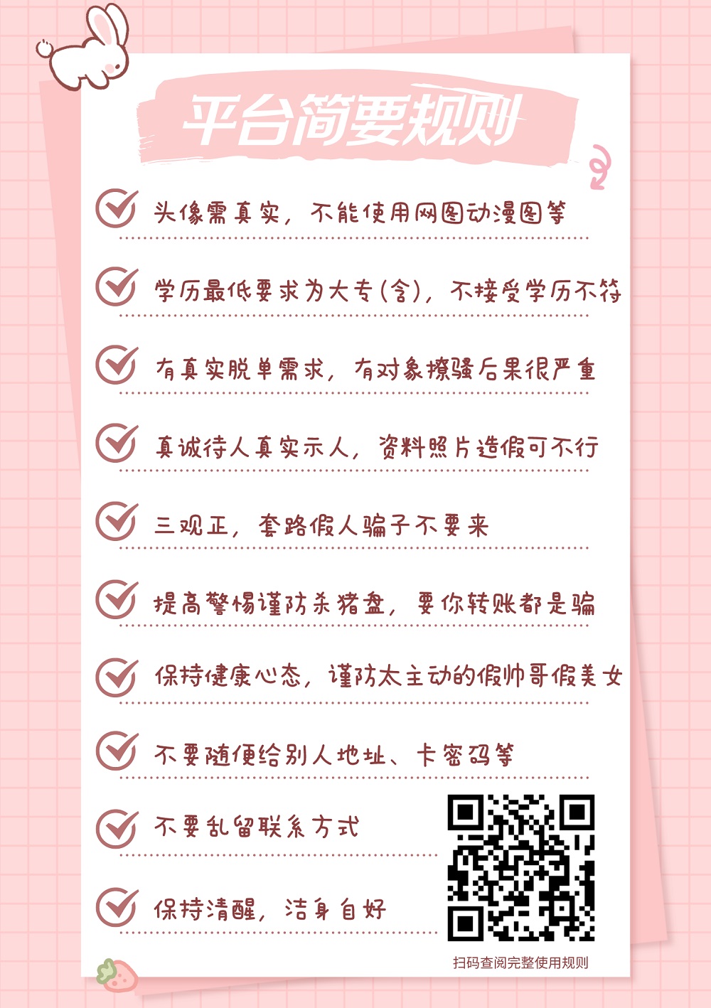 更新了一条心情: #使用教学# 当当当~又到了上课时间!《平台规则简要版》来了,大家一起认证学习,有好的建议欢迎及时提出,遇到坏人及时举报,安全脱单最重要! 全文